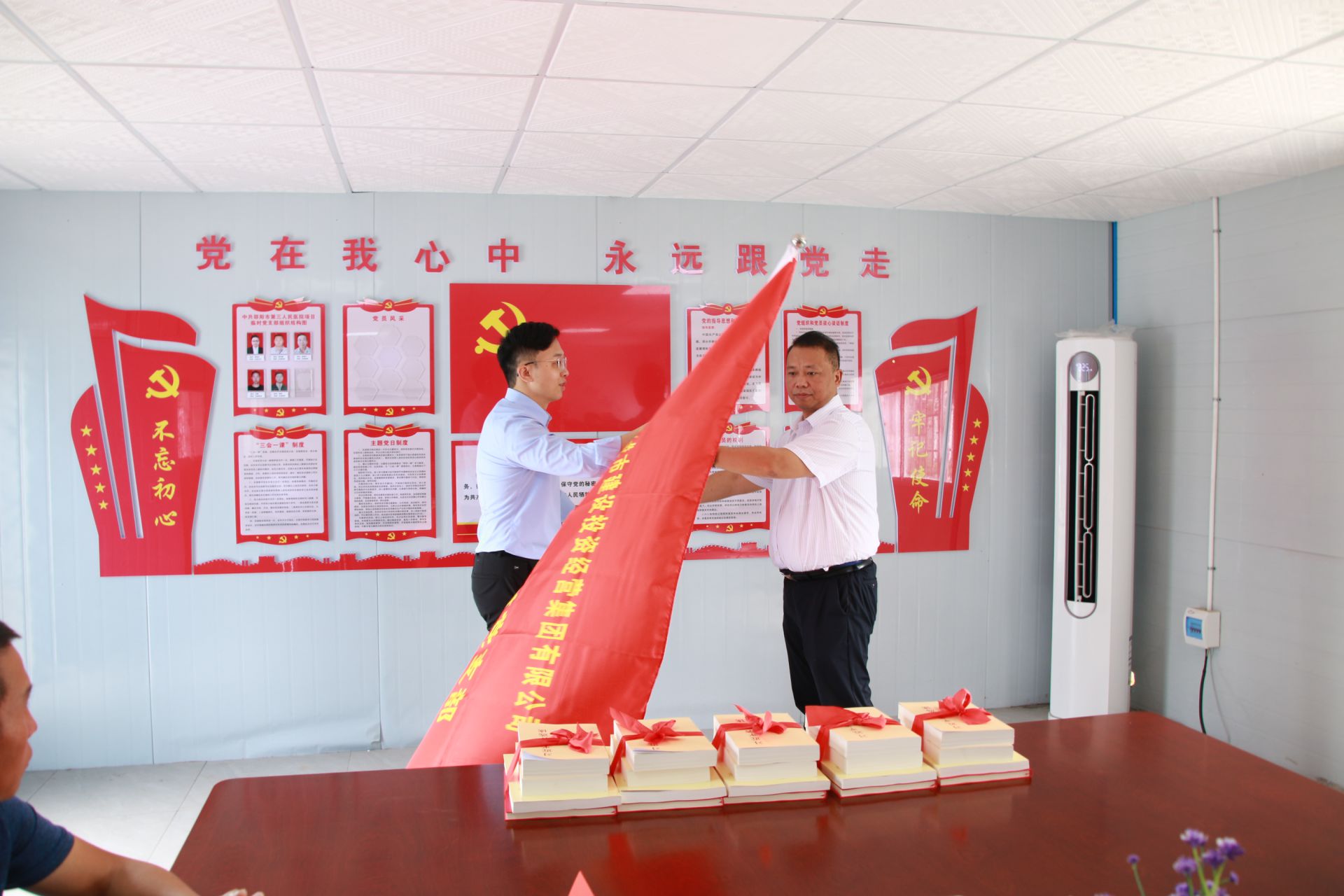 (集團(tuán)黨委書記、董事長范瑾向三醫(yī)院項(xiàng)目臨時(shí)黨支部書記殷俊杰授予黨支部旗幟)