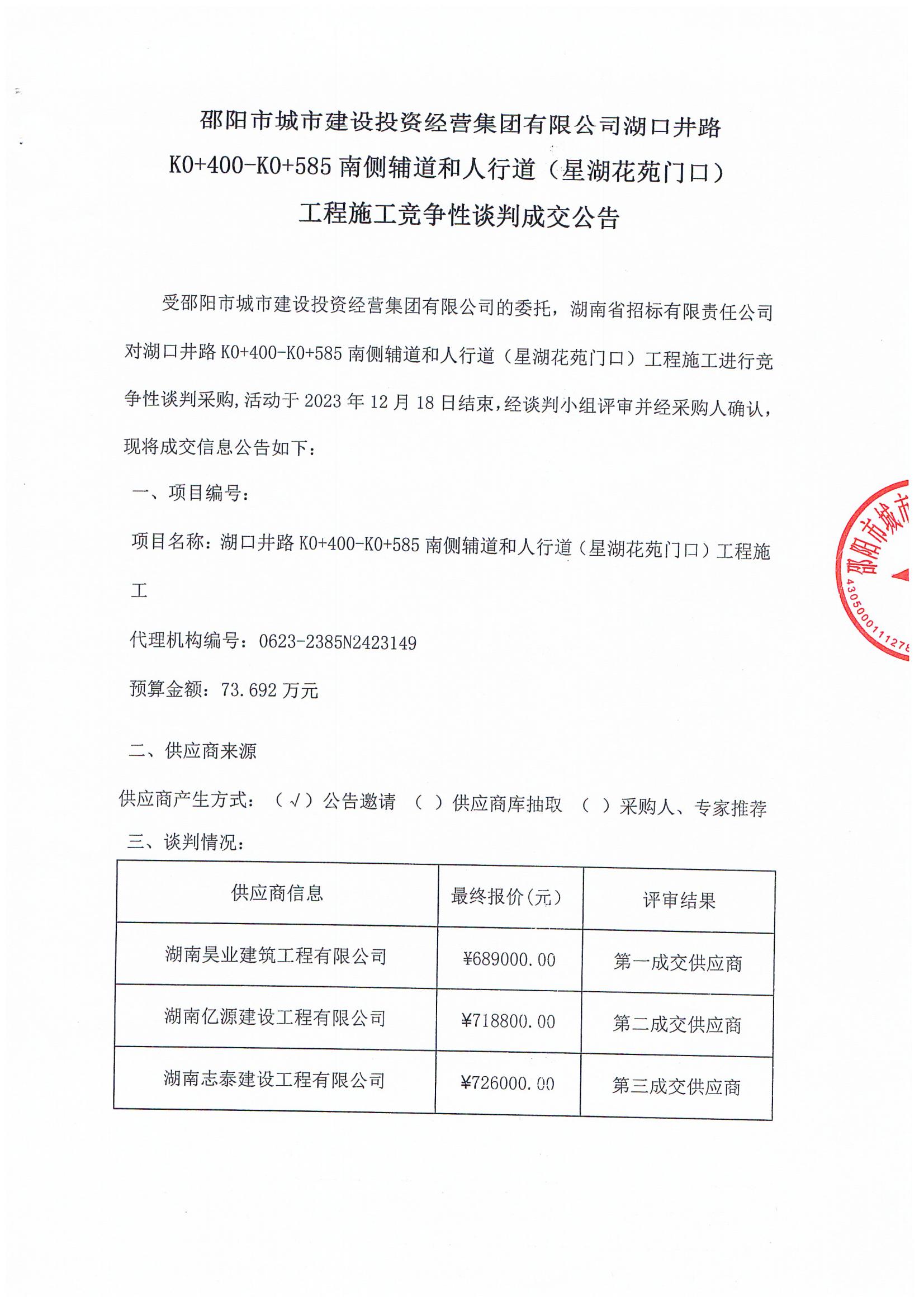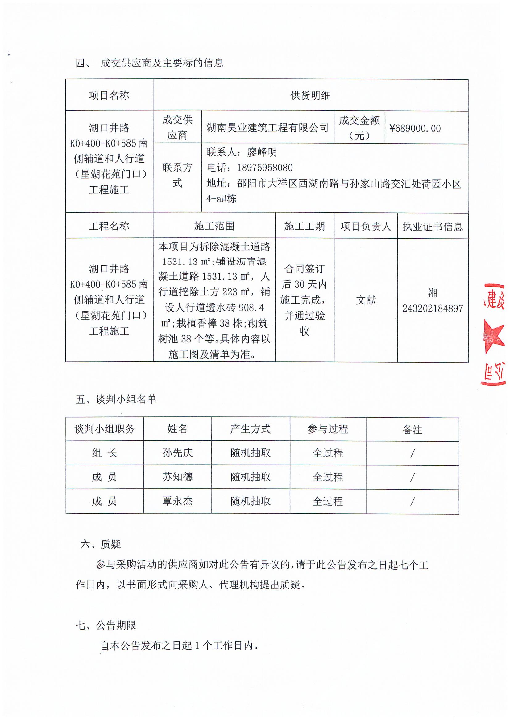 湖口井路K0+400-K0+585南側(cè)輔道及人行道工程施工成交公告