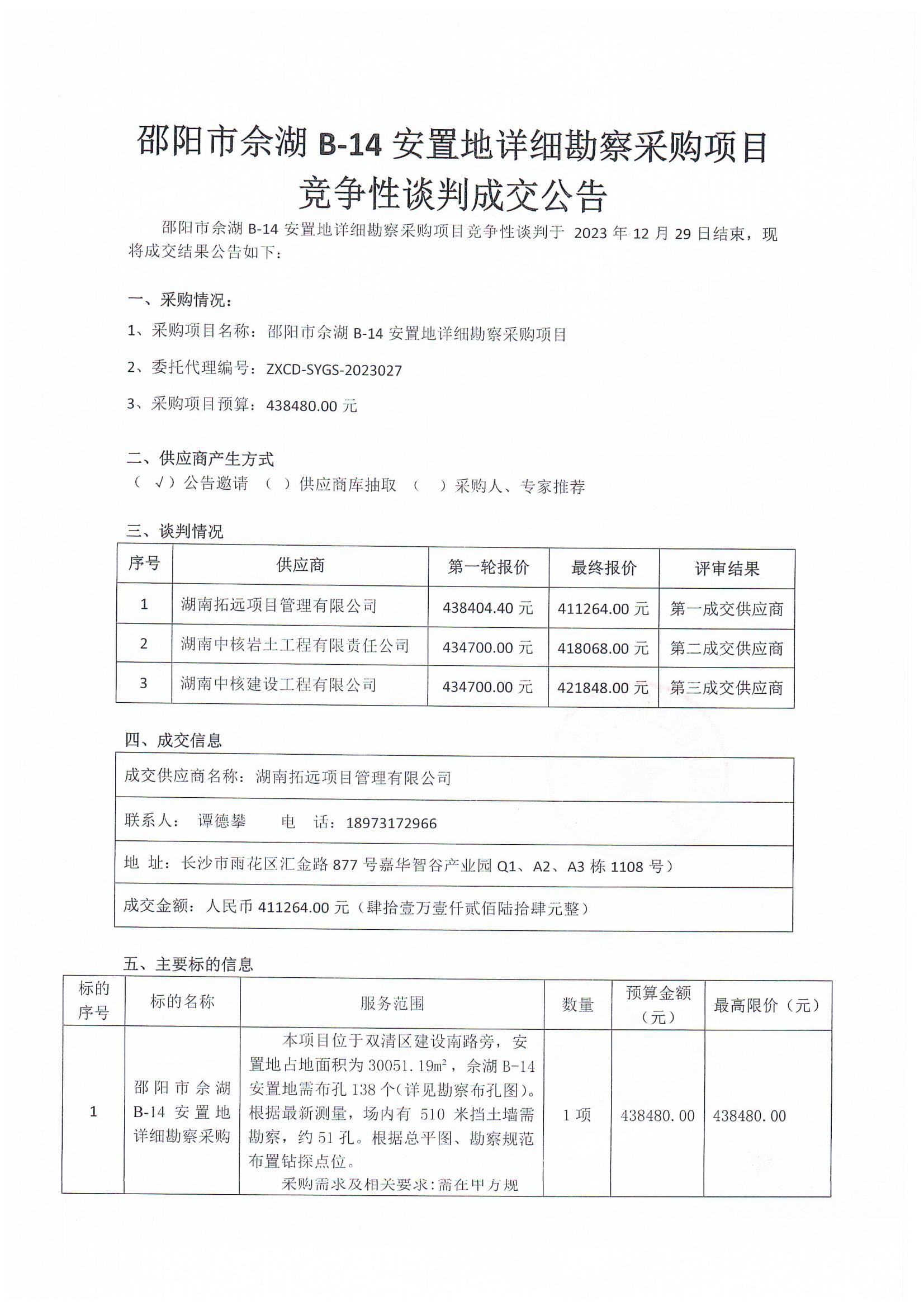 佘湖B-14安置地詳勘競爭性談判成交公告