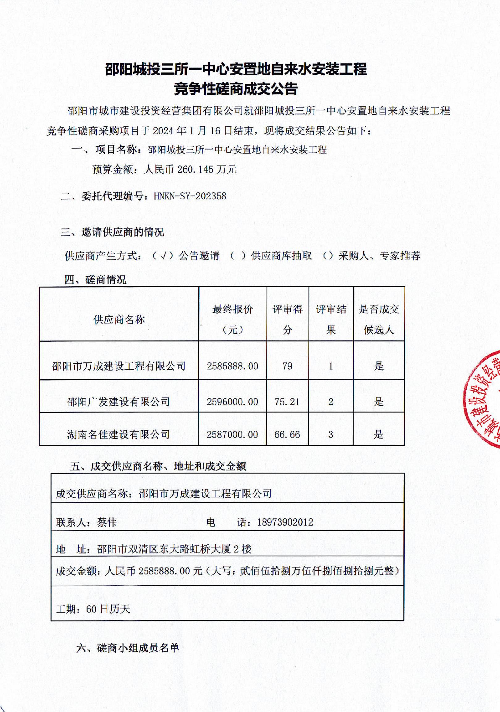 邵陽城投三所一中心安置地自來水安裝工程競(jìng)爭(zhēng)性磋商成交公告