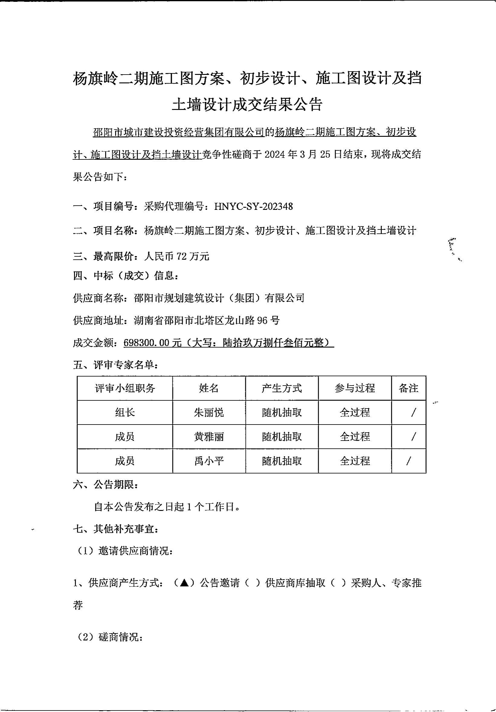 楊旗嶺二期設(shè)計(jì)施工圖初步設(shè)計(jì)成交公告