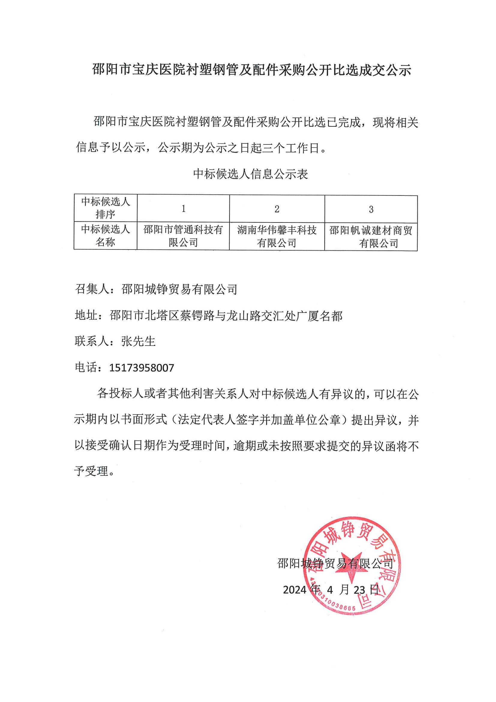 邵陽市寶慶醫(yī)院襯塑鋼管及配件采購(gòu)公開比選成交公示