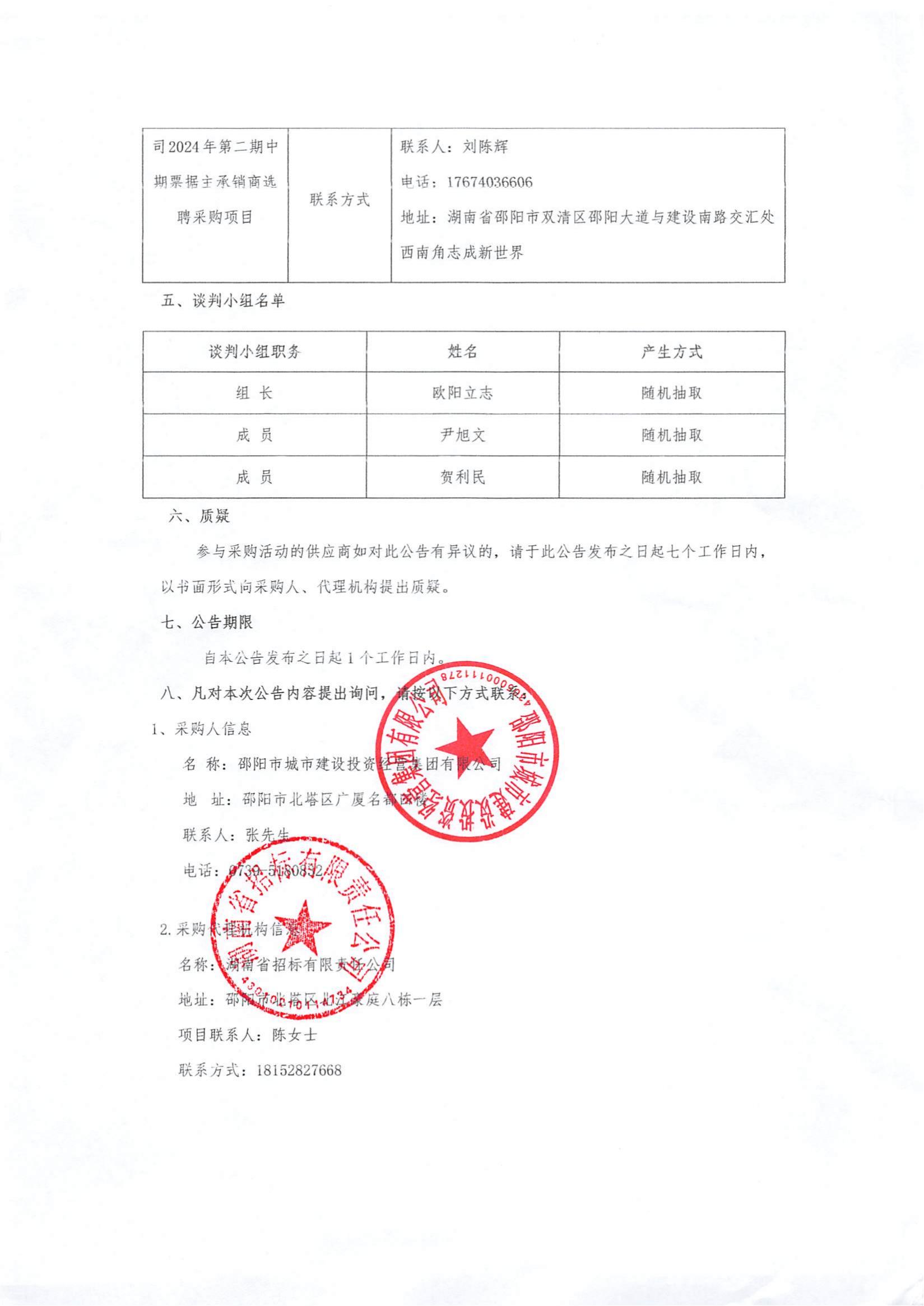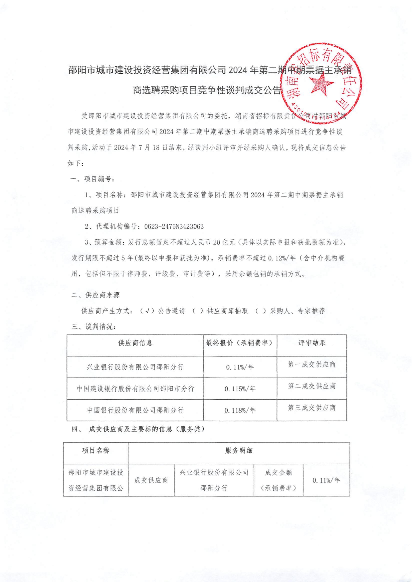 邵陽市城市建設(shè)投資經(jīng)營集團(tuán)有限公司2024年第二期中期票據(jù)主承銷商選聘采購項目競爭性談判成交公告