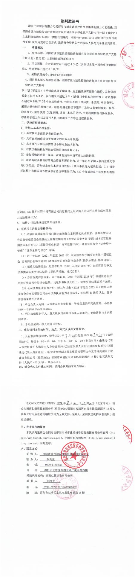 邵陽市城市建設(shè)投資經(jīng)營(yíng)集團(tuán)有限公司自來水綠色資產(chǎn)支持專項(xiàng)計(jì)劃(暫定名)主承銷商選聘采購(gòu)項(xiàng)目談判邀請(qǐng)書