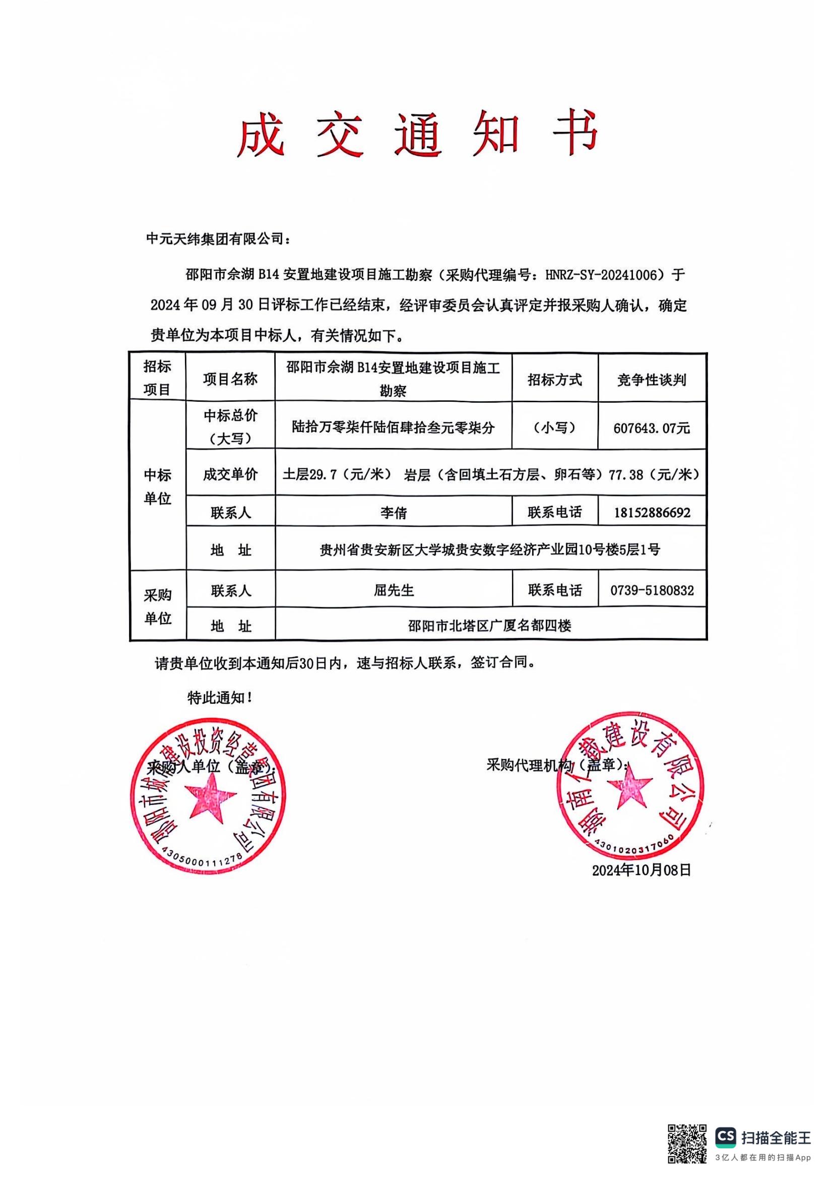 佘湖B14安置地建設(shè)項目施工勘察成交通知書