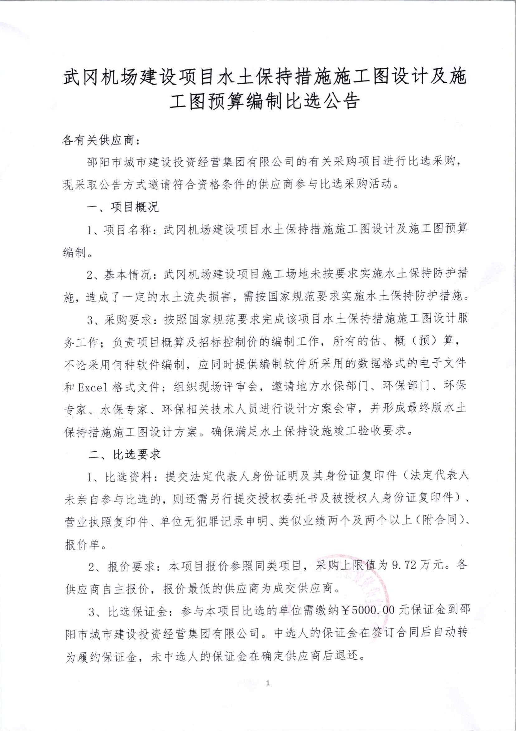 武岡機(jī)場建設(shè)項目水土保持措施施工圖設(shè)計及施工圖預(yù)算比選公告