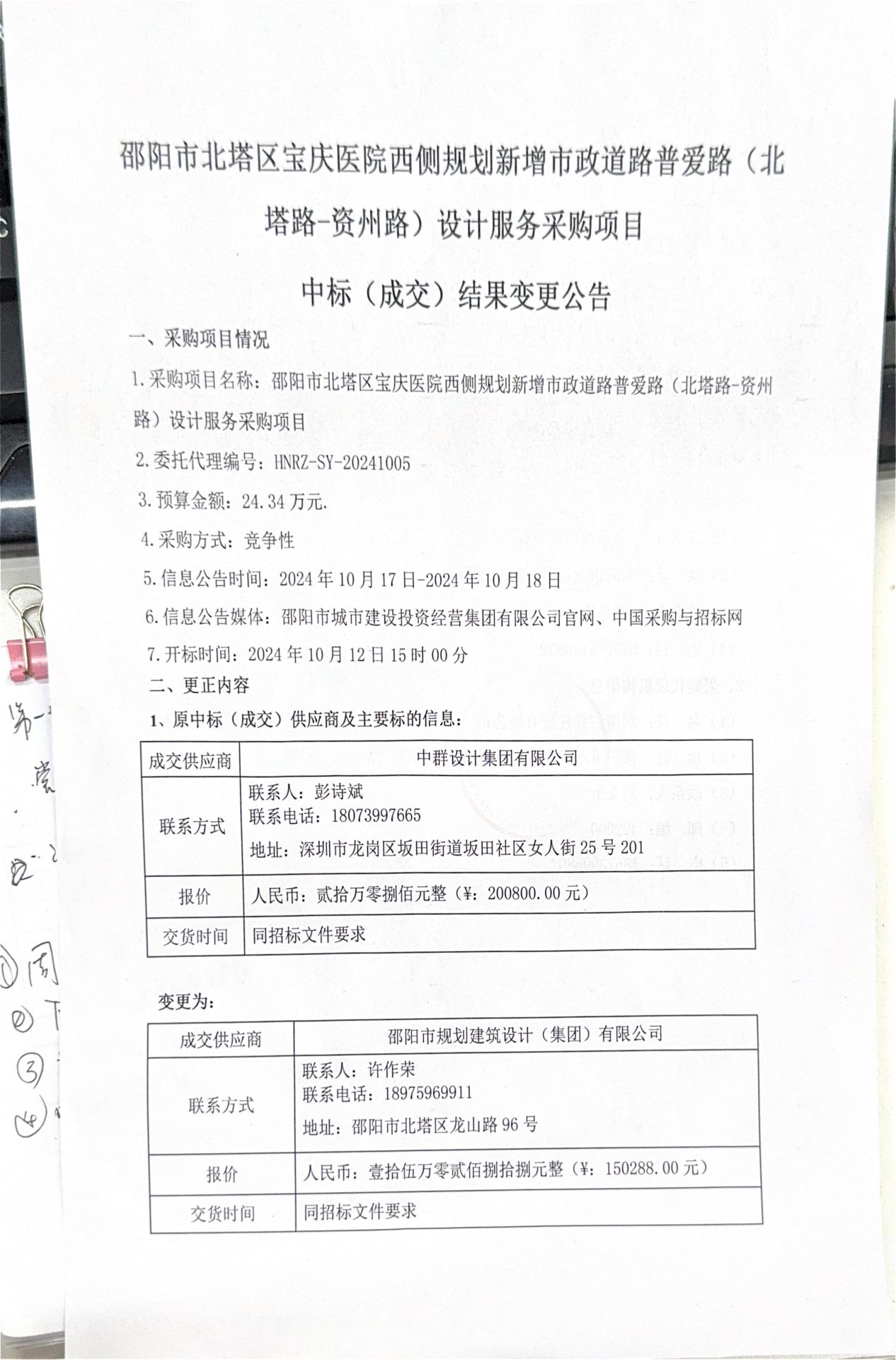 普愛路設(shè)計變更公告(設(shè)計服務(wù)項目)