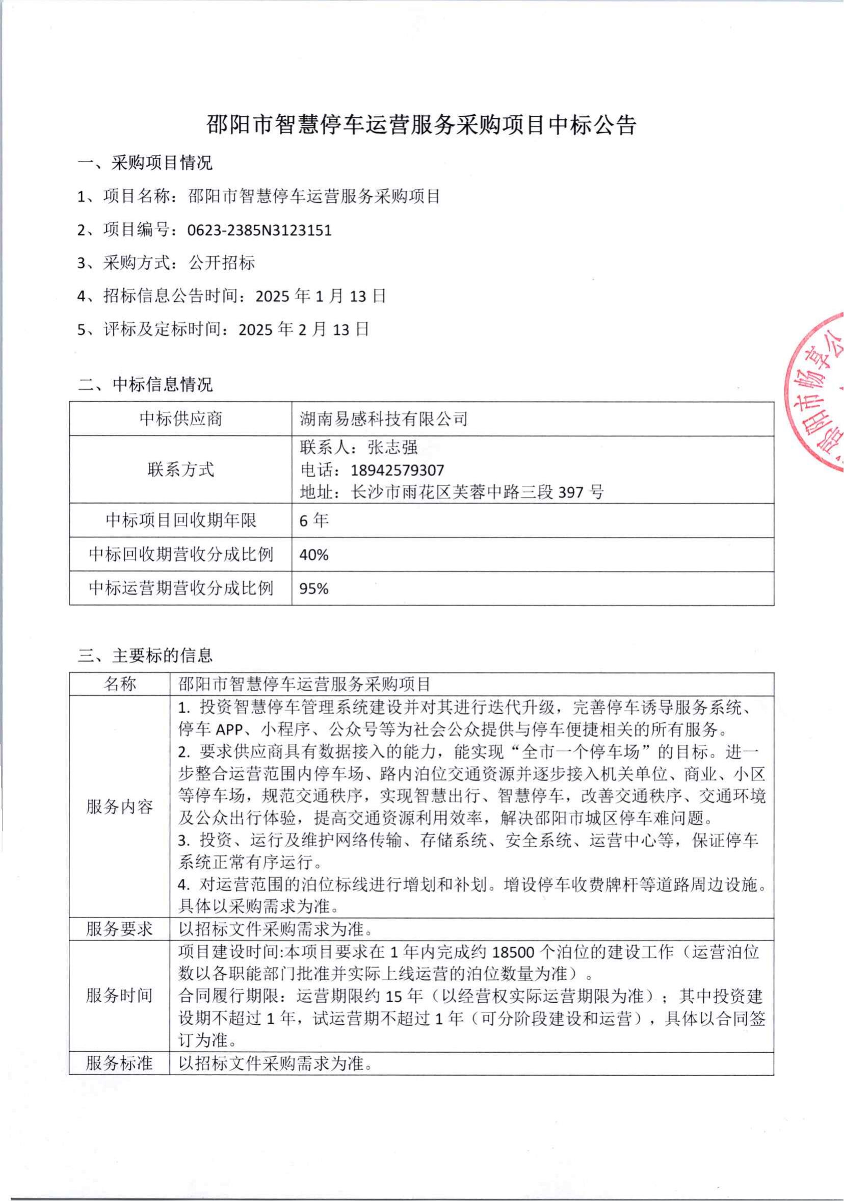 邵陽市智慧停車運(yùn)營服務(wù)采購項(xiàng)目中標(biāo)公告