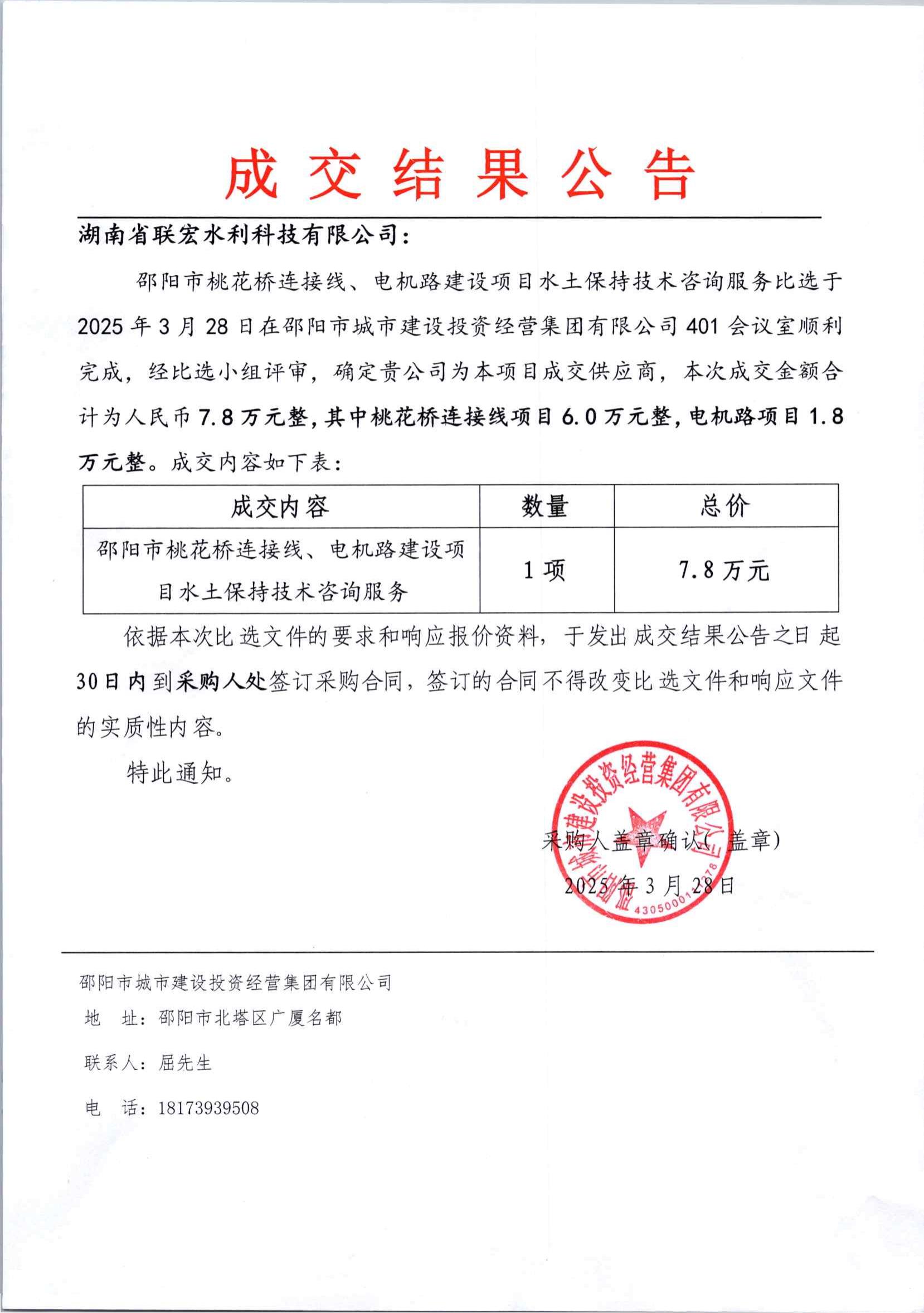 桃花橋連接線及電機(jī)路水土保持水土保持技術(shù)咨詢服務(wù)比選成交結(jié)果公告